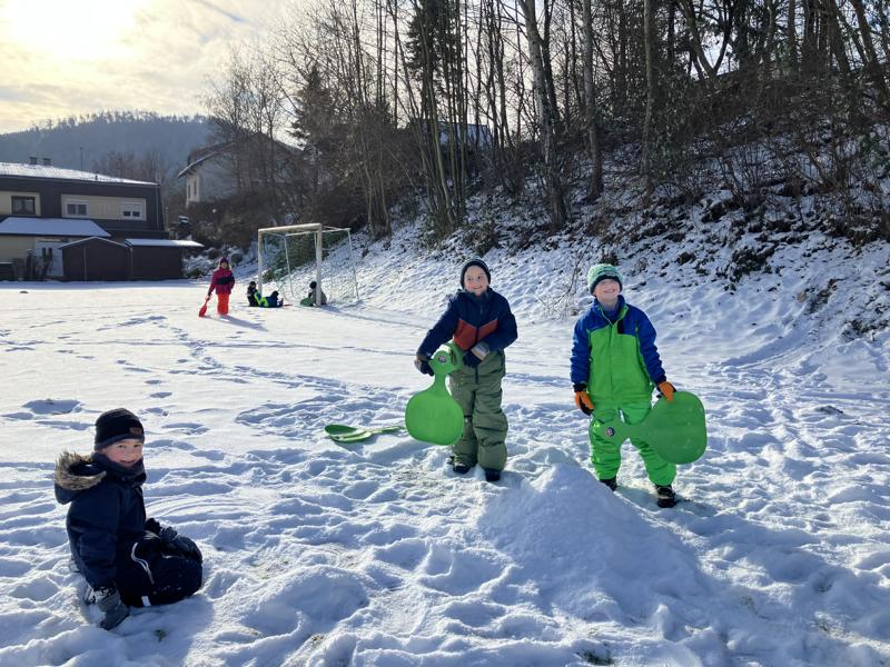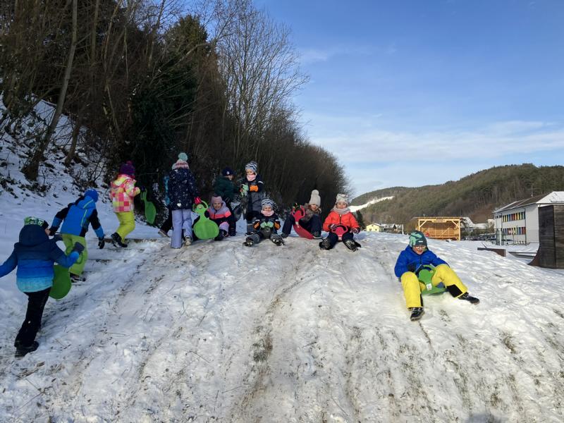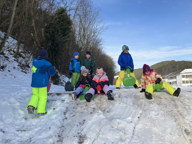 Die Kinder der 3b hatten beim Bobfahren sehr viel Spaß. Mit großer Begeisterung sausten sie den Berg hinunter, lachten und feuerten sich gegenseitig an. Auch die Kinder der 1. Klasse waren gemeinsam im Schnee. Ein schönes Erlebnis, das für viel Freude und gute Stimmung sorgte.